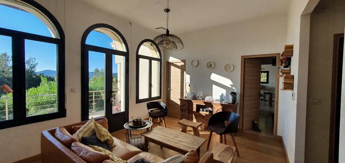 Elle accueille confortablement 2 ou 3 familles avec ses 4 chambres, 3 salles de bain, un studio indépendant au rez-de-jardin, un salon avec une cheminée, une salle à manger séparée, une cuisine séparée, 2 belles terrasses, un solarium à la vue fantastique, une terrasse ombragée, un terrain de boules. Le jardin de 1000m² est accueillant avec ses restanques arborées et ses vieux mimosa, cyprès et chênes liège.