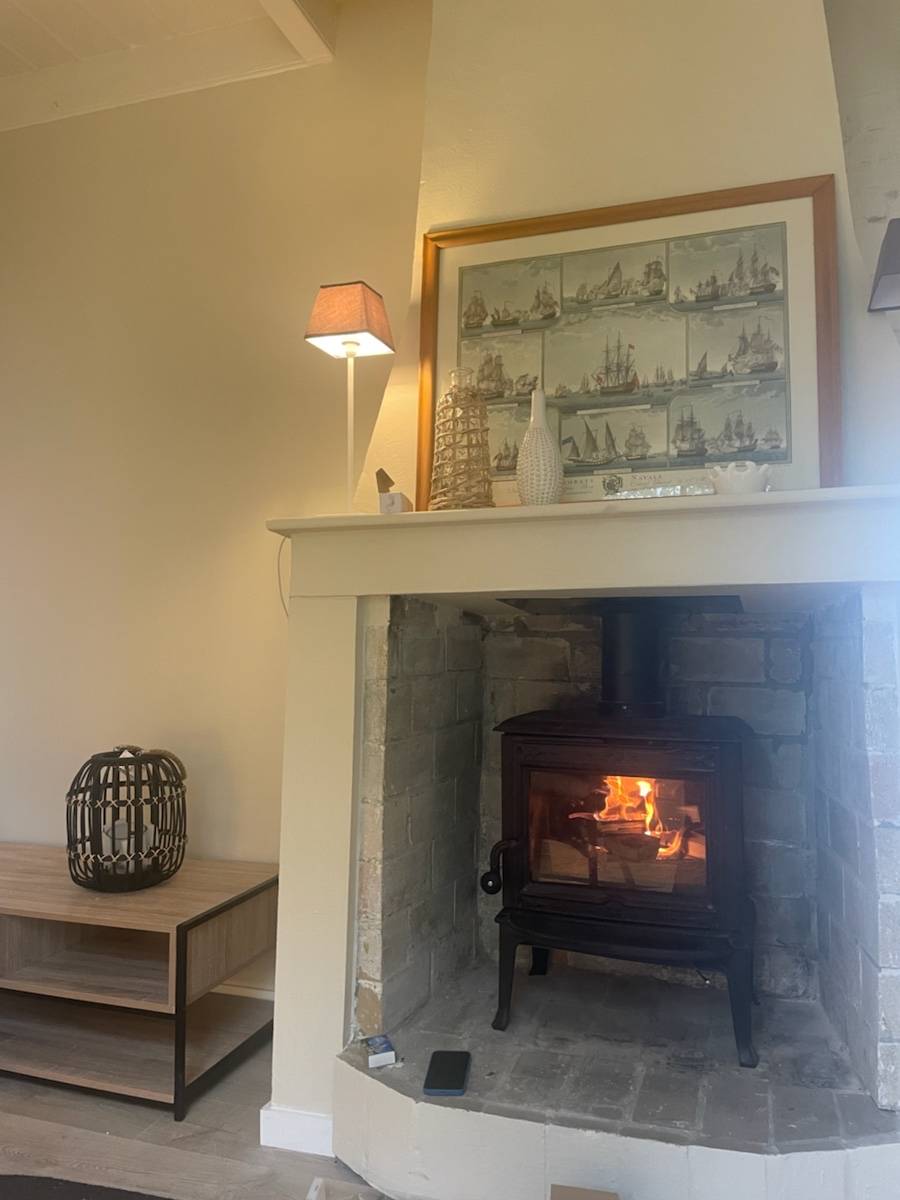 Salon cosy avec cheminée, télévision et canapé)