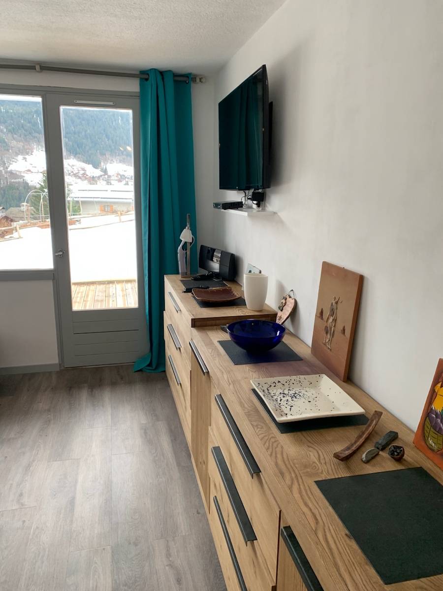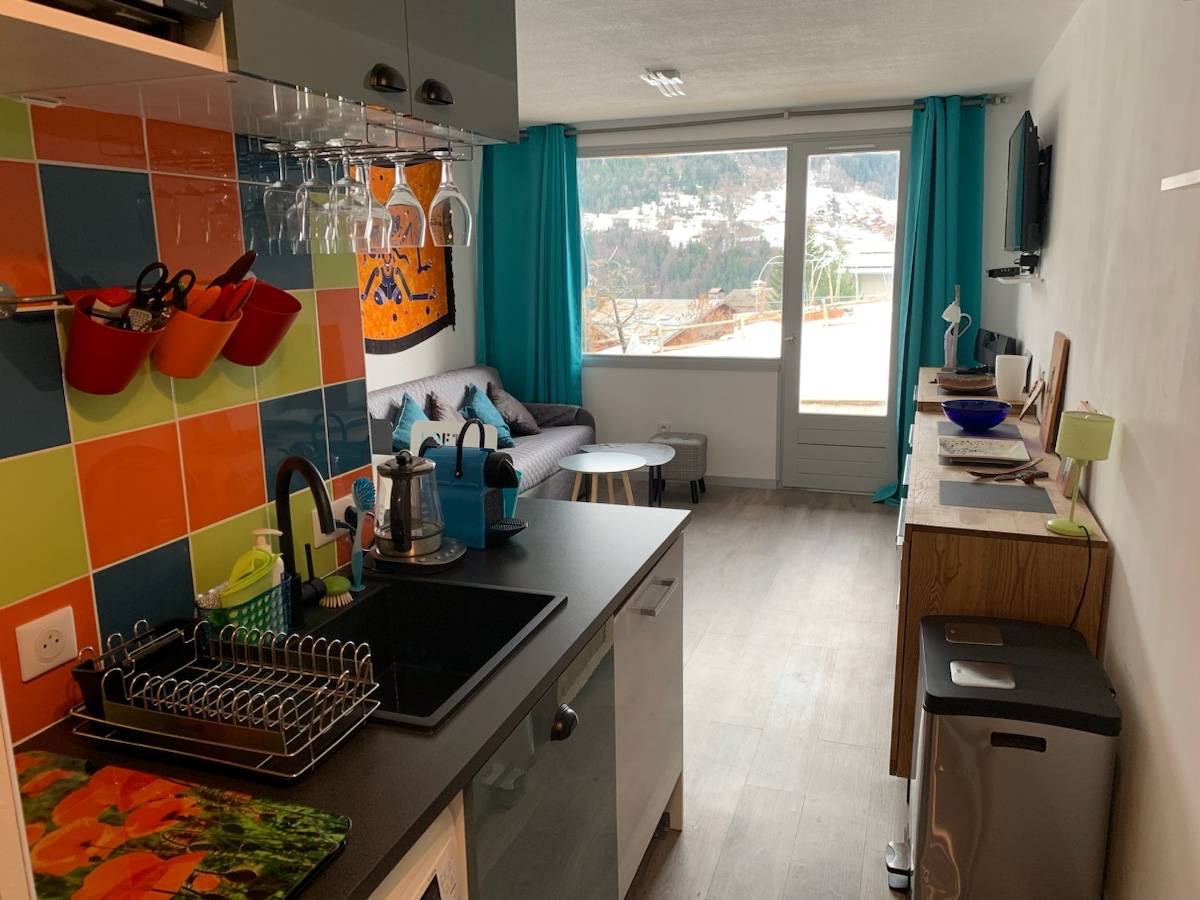 Petit cocon de 30m² , tout confort, refait à neuf, en rez de jardin avec 13m² de terrasse en bois devant un grand pré. Magnifique vue dégagée sur La Dent de Burgin.