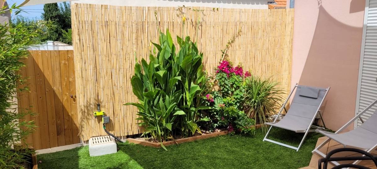 Petit extérieur sans vis à vis terrasse bois avec table,chaises pour vos repas et chaises longues pour la détente.