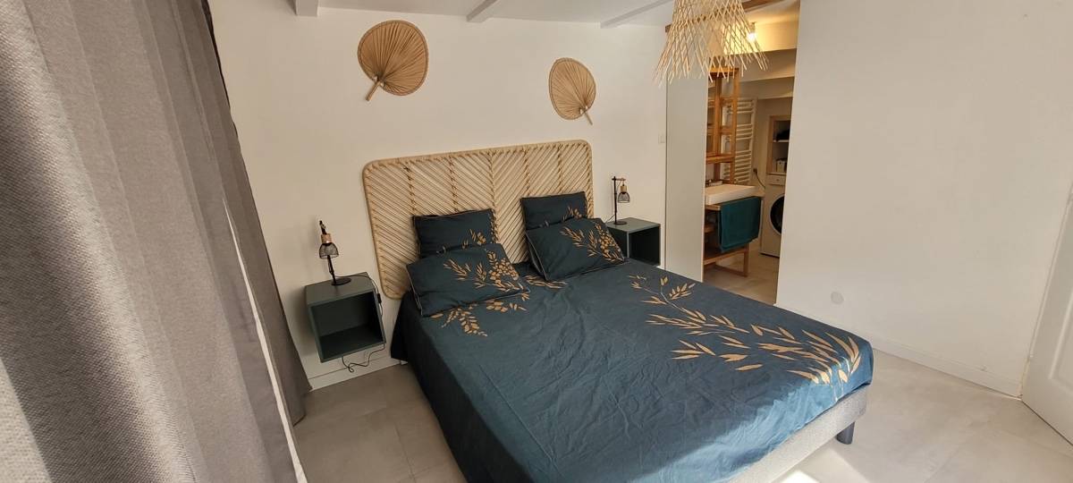 Au RDC cuisine toute équipée avec coin repas, salon avec tv Gd écran,wc indépendant, une chambre lit 160/200 avec dressing et sall