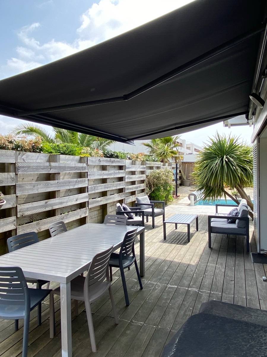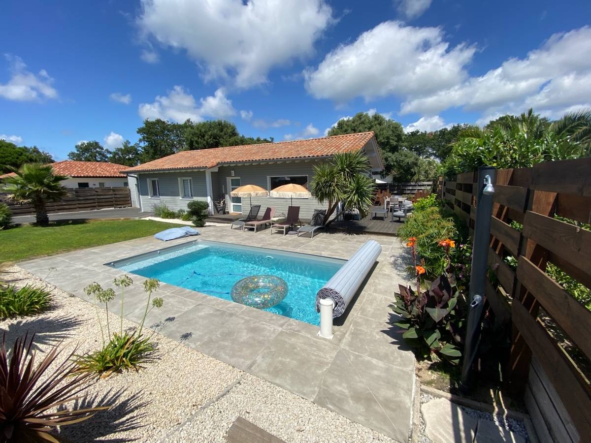 La maison dispose d’une grande terrasse avec plancha et barbecue, ainsi que d’une piscine chauffée au sel (28°C). La piste cyclable au pied de la maison permet de rejoindre le golf d’Hossegor, le centre-ville, les plages et le port en quelques minutes.